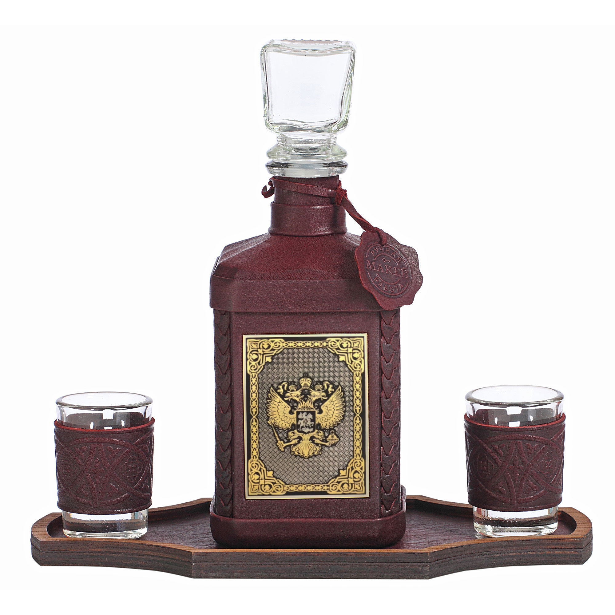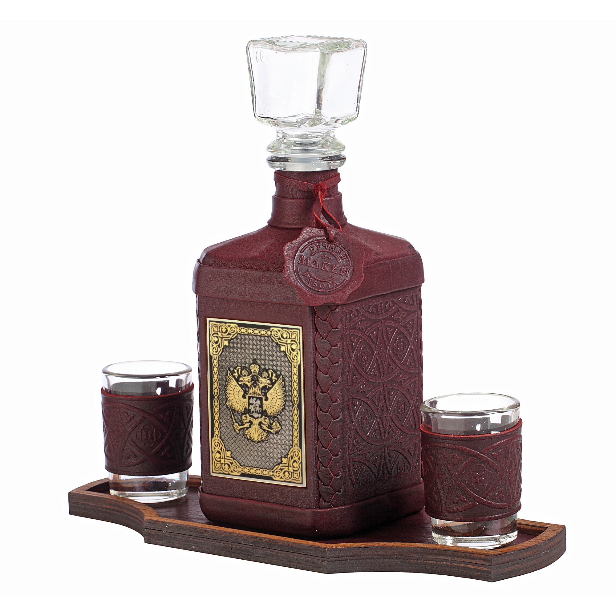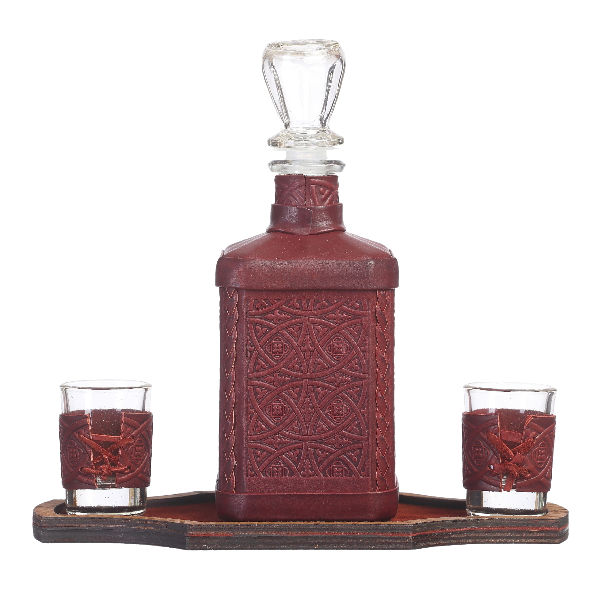 Оригинальный графин в кожаном футляре на подставке с двумя рюмками органично впишется в интерьер вашего дома или офиса, станет прекрасным подарком ценителю крепких спиртных напитков.