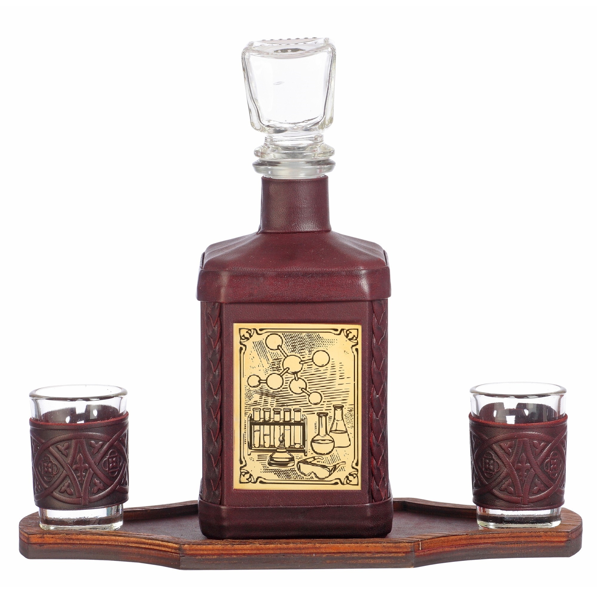 Оригинальный графин в кожаном футляре на подставке с двумя рюмками органично впишется в интерьер вашего дома или офиса, станет прекрасным подарком ценителю крепких спиртных напитков.