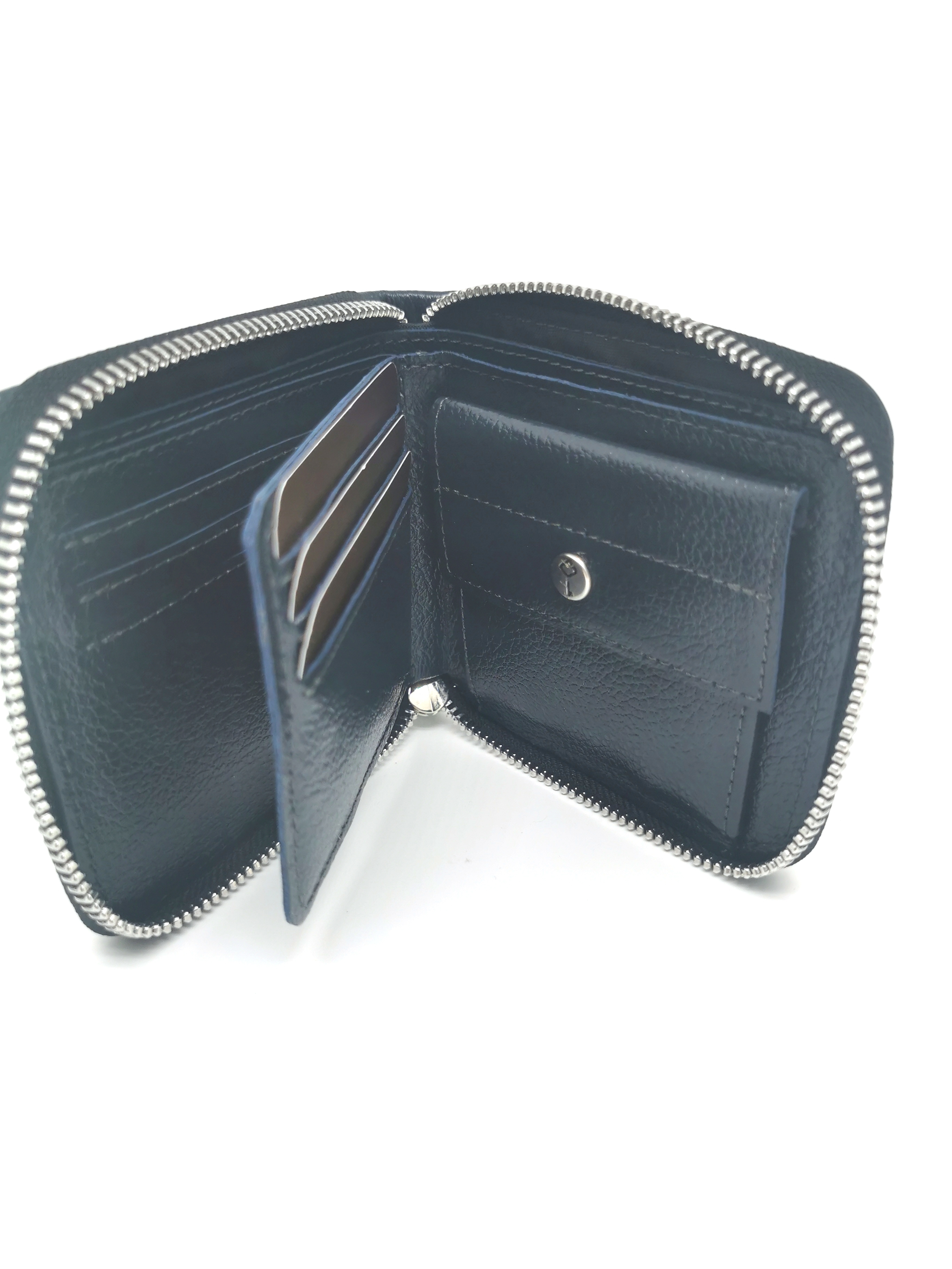 2 отделения для купюр, монетницу на кнопке и 9 отделений для кредитных карт
