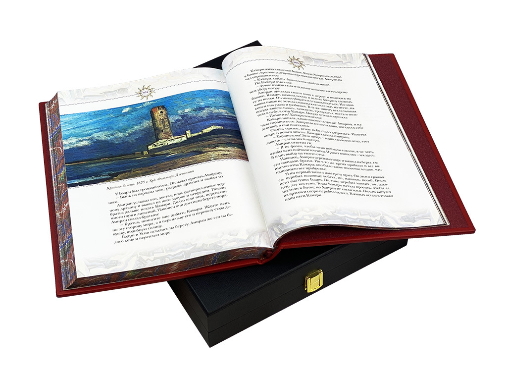 Издание представлено в оригинальной подарочной коробке. Дизайн прекрасно сочетает в себе золотое и блинтовое тиснение, художественную металлическую вставку, соответствующую тематике издания, а также крашенный в тон переплетного материала обрез. Цельнокожаный переплет ручной работы Высококачественная бумага, красочные иллюстрации, ляссе.