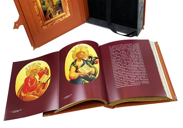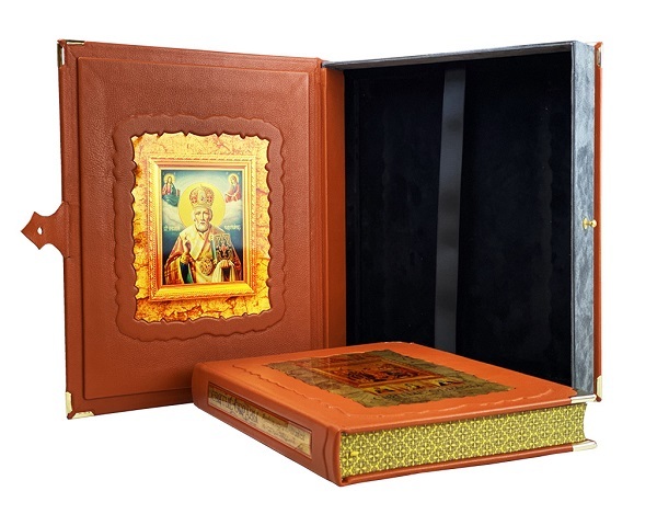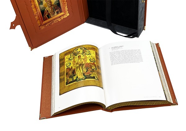 Кожаный тисненый переплет ручной работы с художественными вставками, металлические уголки. Исполнение в оригинальной кожаной подарочной коробке с художественными накладками. Сертификат в комплекте.