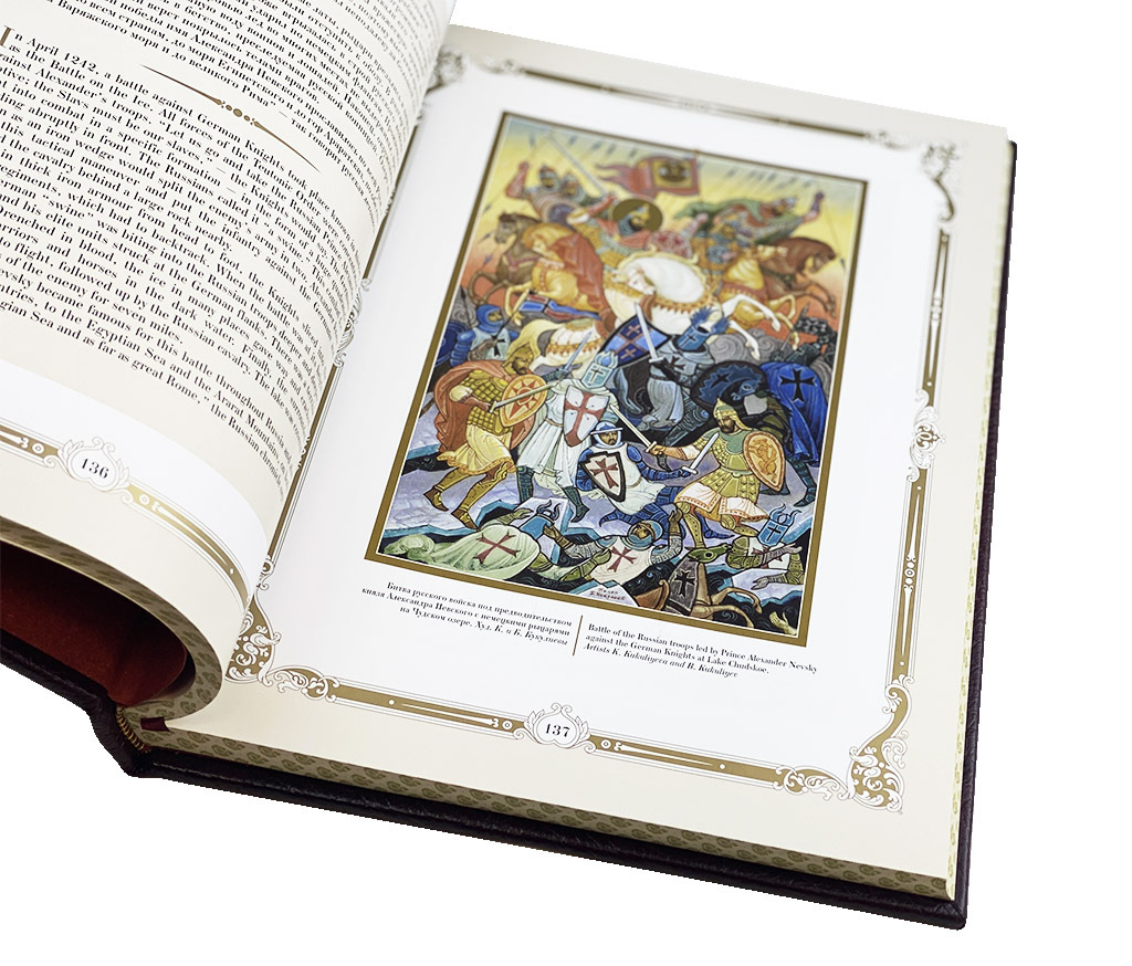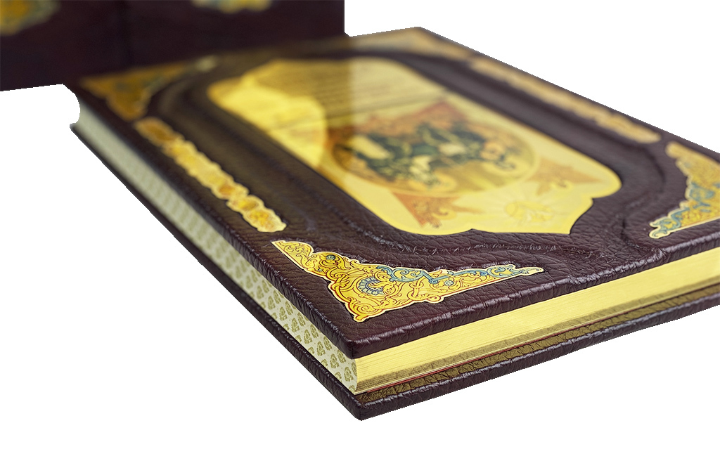 Книга представлена в уникальном подарочном коробе-складне, сделанном из дерева, и обтянутым вручную высококачественной натуральной кожей. Издание оформлено сублимационными табличками, дизайн которых соответствует общей тематике, рисованный обрез, ляссе. Высококачественная бумага.